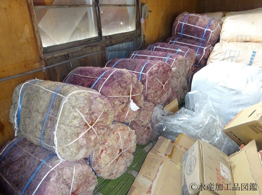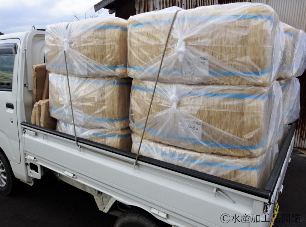 - 出荷 精選を終えた寒天は20㎏がドラム状に結束・袋詰めされ、乾物問屋・和菓子メーカーに出荷される(写真10)。賞味期限は2年間である。