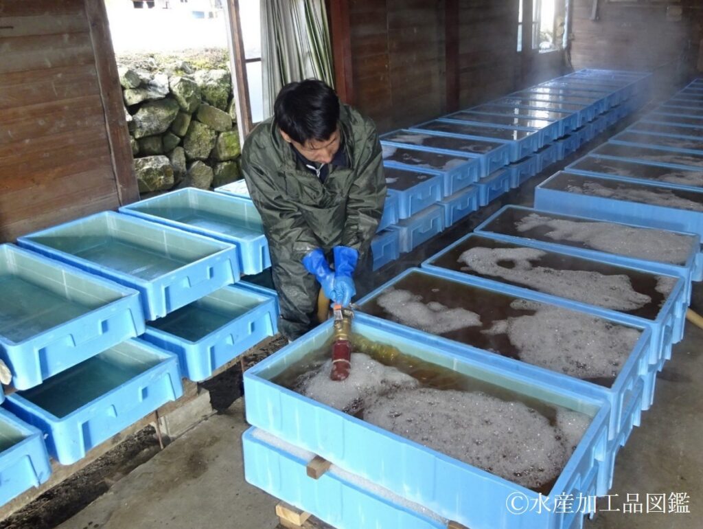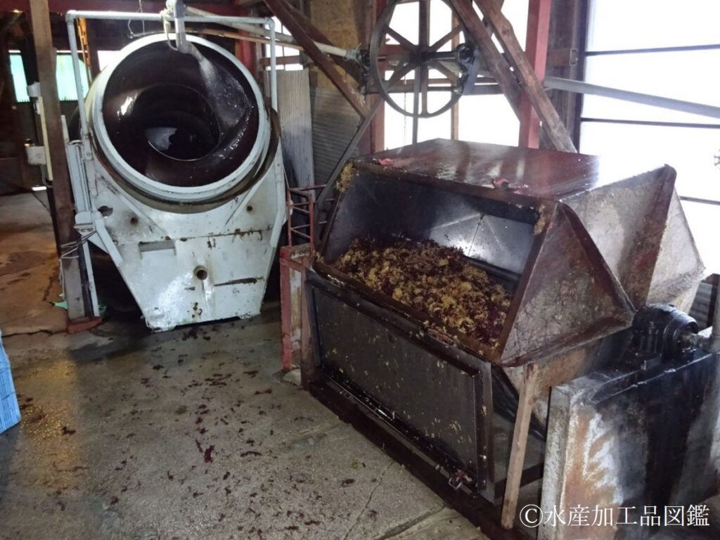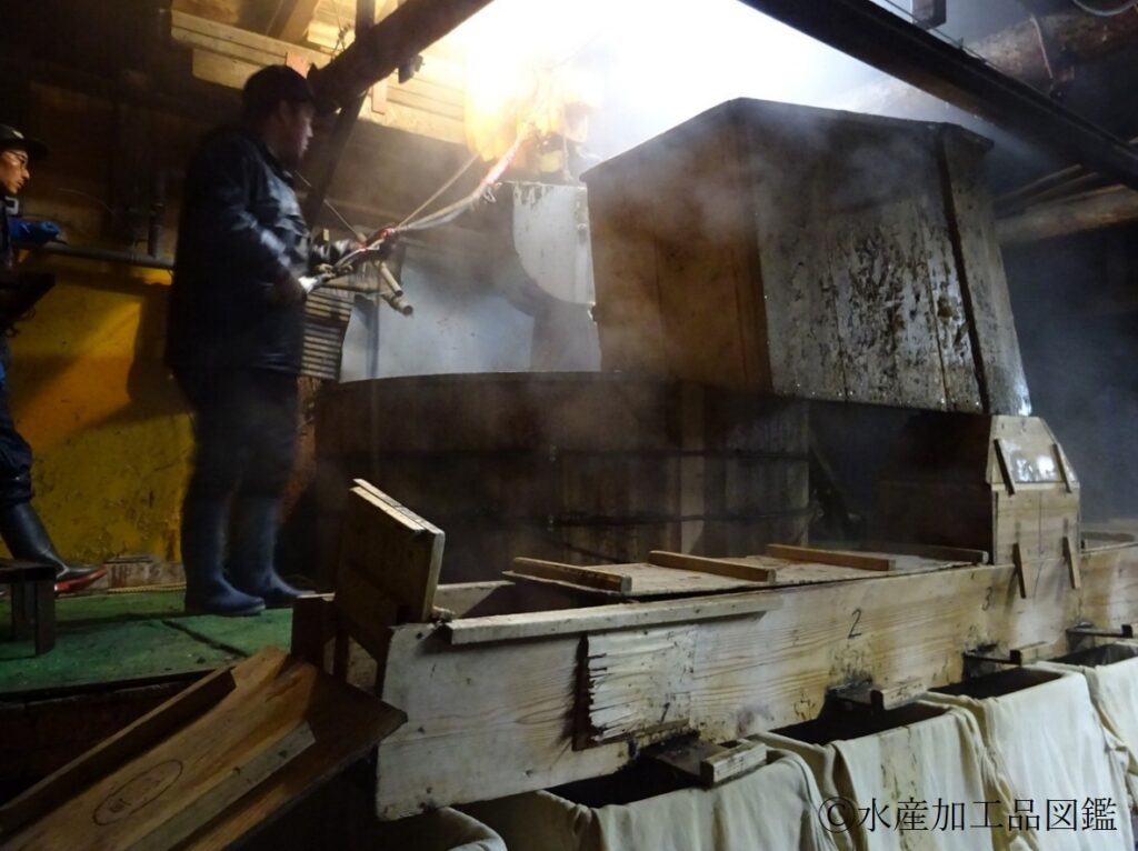 - 煮熟 鋳鉄製(もしくはステンレス製)釜に檜製の胴をはめた釜が使用される(写真3)。熱源は重油バーナーかボイラーである。また、煮汁のpHを6.5付近に調整するための加工助剤として硫酸が用いられる。