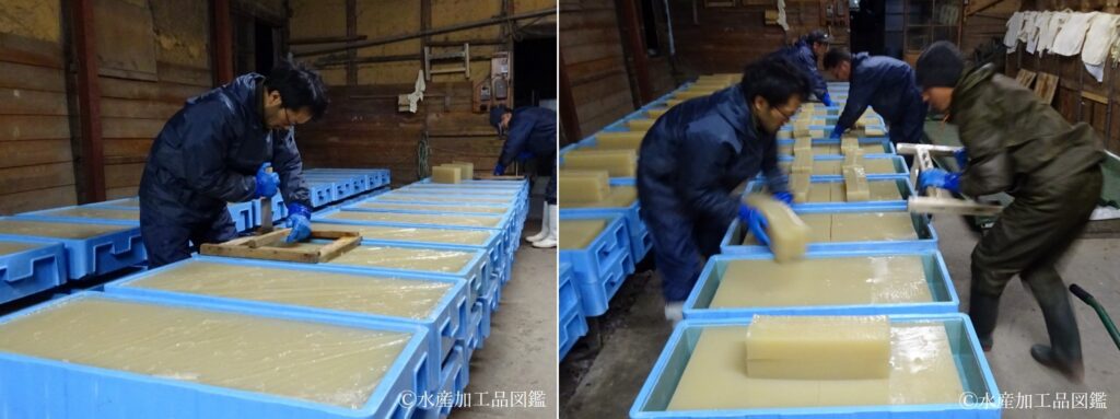 - 截ち 専用の「天切り包丁」と「マンガ」を使用し、羊羹状に切り分ける(写真6)。