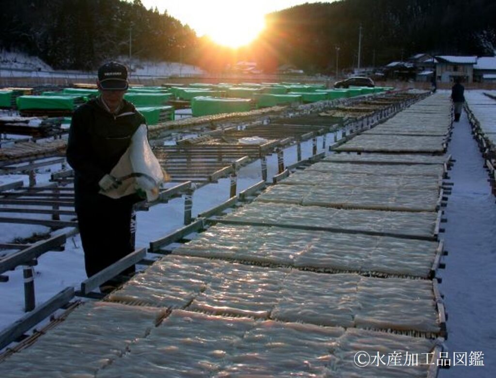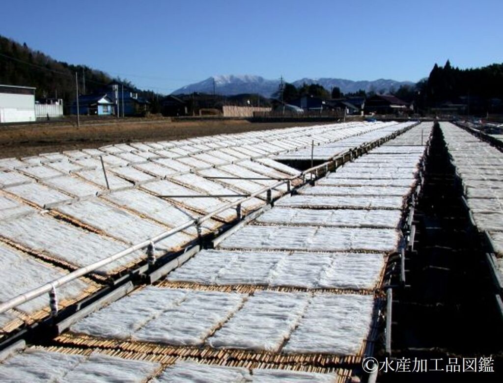 - 乾燥 凍結と融解を繰り返し、約2週間かけて乾燥させる(写真9)。降雨時には葦簀を積み重ねてビニールシートで被う。また、風が強いと風乾し、色択や形状が悪くなる。