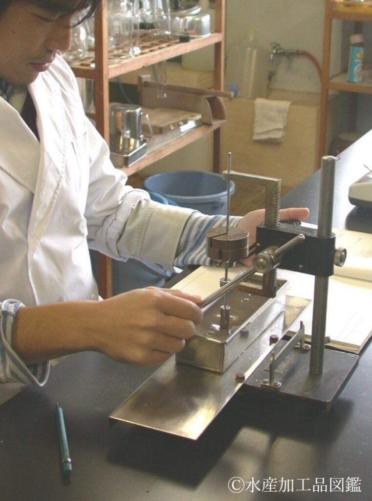 ゼリー強度430~530g/cm²(日寒水式ゼリー強度試験、写真11)、60℃での粘度7.0 c.p以上(B型粘度計)が一般的に優良品とされている。また、用途により物性の強弱が求められる場合は、原藻の配合割合を変えて製造される。なお、細寒天の地域ブランドとして知られる“山岡細寒天” (写真12)は、岐阜県寒天研究室(現 岐阜県食品科学研究所寒天研究室)による品質検査と品質向上を目的とした岐阜県寒天品評会(現 岐阜県寒天水産工業組合主催)を1937(昭和12)年から実施してきたことが認められ、2006(平成18)年に特許庁の地域団体商標に登録された(商標登録5008729号)。