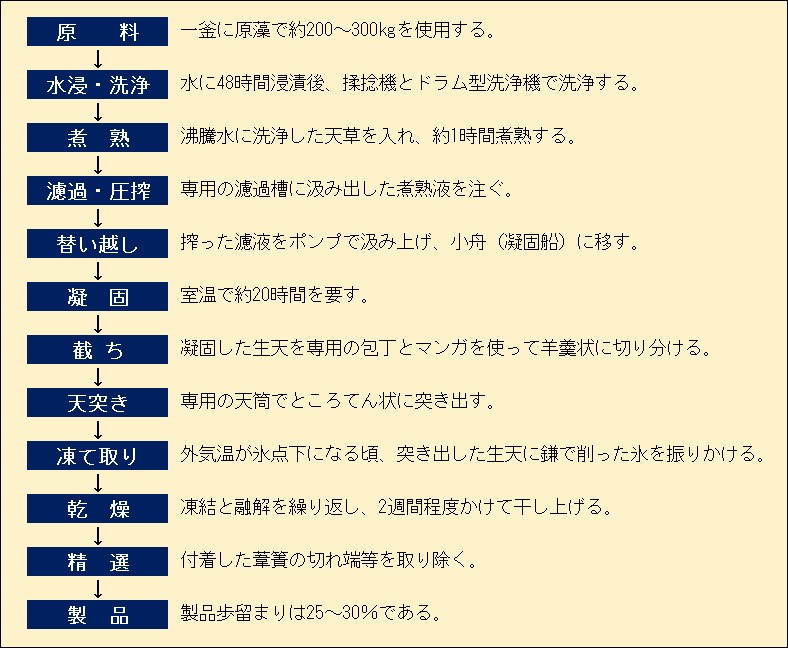 テングサに含まれる寒天成分(アガロース、アガロペクチン)が熱水に溶解し、冷水に溶けない性質を利用して製造される。つまり水浸・洗浄したテングサを煮熟し、熱時濾過・搾汁することにより、熱水溶性の寒天成分と熱水不溶性のテングサ残渣(セルロース等)に分ける。搾汁した煮汁は冷めると凝固し、生天となるが、テングサ由来の色素・臭気成分を含むため、これを単に乾燥しただけでは製品とすることはできない。このため、生天を細く突き出し、凍結することで寒天ゲルの保水力を低下させ、続いて融解させることで凍て水(寒天から滴り落ちる融解水)とともに水溶性の色素·臭気成分を流出させる。この凍結と融解を繰り返すことで不要成分を除去し、最終的に乾物とすることで、常温流通・長期保存が可能な製品となっている。