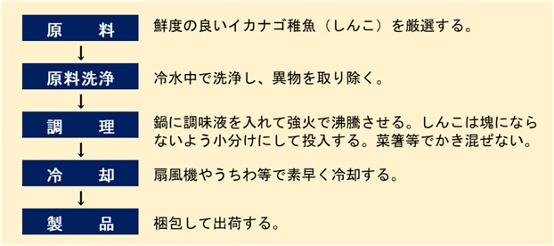 • 調理 鍋に醤油、砂糖、みりんを入れ、強火で沸騰させる。沸騰したら、しんこを2、3回に分けて鍋に入れる。ふたたび沸騰してきたら、アク取りをする。しょうがの千切りを入れて、そのまま強火で炊く。煮汁が少量になれば、中火にして鍋を時々打ち返しながら煮汁がほぼなくなるまで煮詰める。