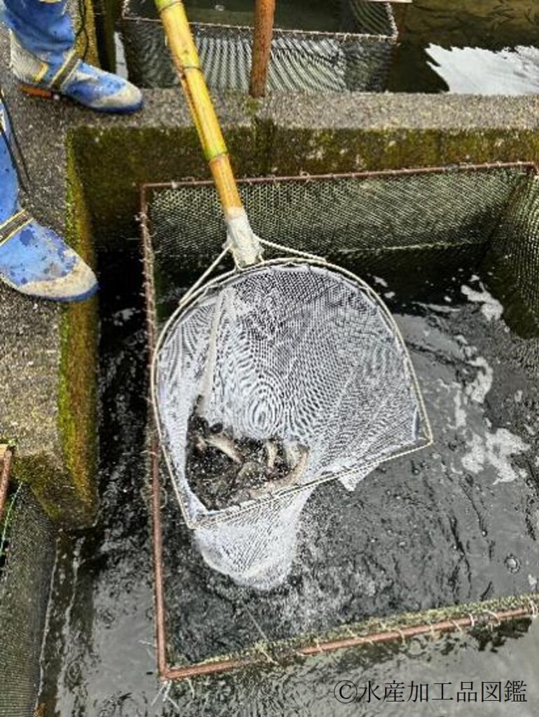 • 原料 工場からすぐ近くの養殖場で原料魚を取り上げ(写真4)、活け締めを行う。