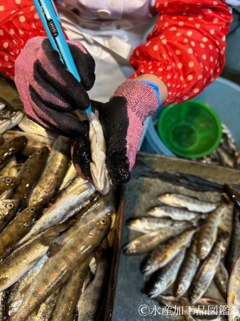 均一な加熱・味付のため、適したサイズ(40~50g、15cm程度)を限定して使用するのが望ましい。現在は原料のほとんどが養殖魚であるため、飼育段階から加工用を選別し給餌量を調整しながら、1年間程で該当サイズに飼育している写真2