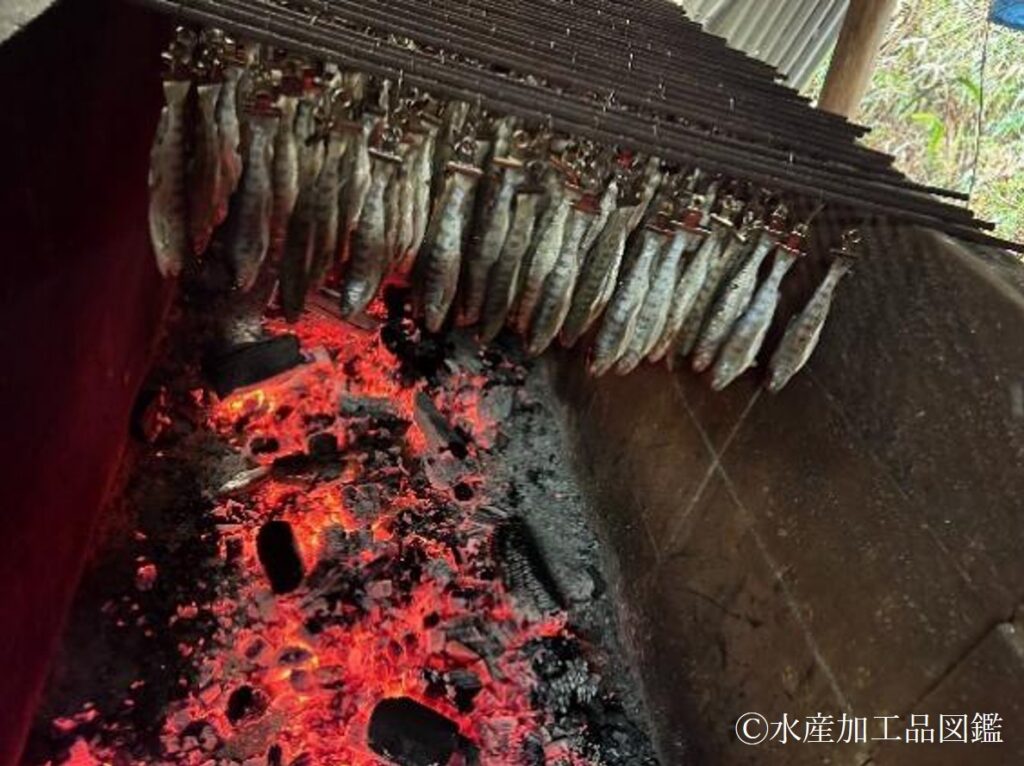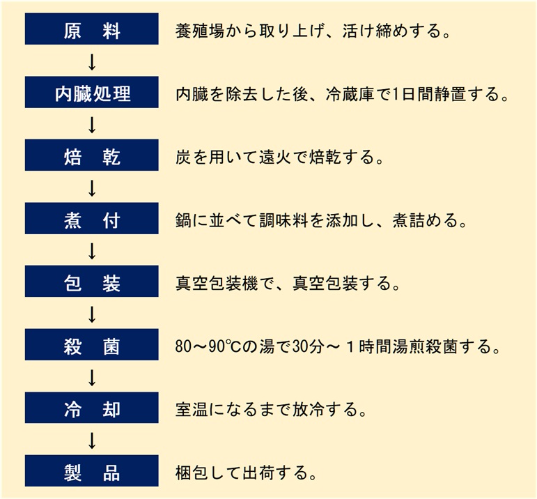味が染みこむように炭火で原料魚を乾燥させて、水分活性を低下させることで保存性を高める。湯煎殺菌は温度を管理しながら行う。