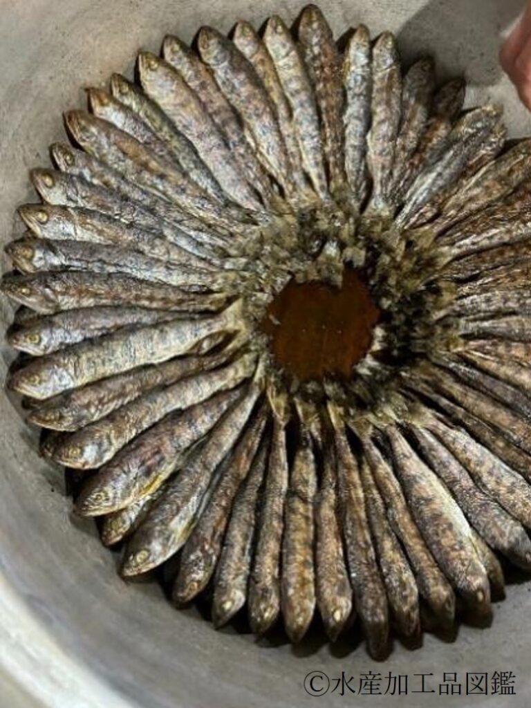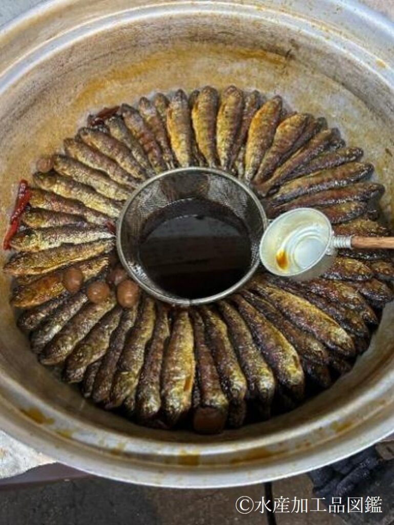 宮崎県内の五ヶ瀬町で製造している甘露煮は炭火で焙乾する点が特徴といえる。炭火で遠火にして時間をかけて加熱することで、骨まで食べられる柔らかさになり、独特の炭の香りも楽しむことができる写真3