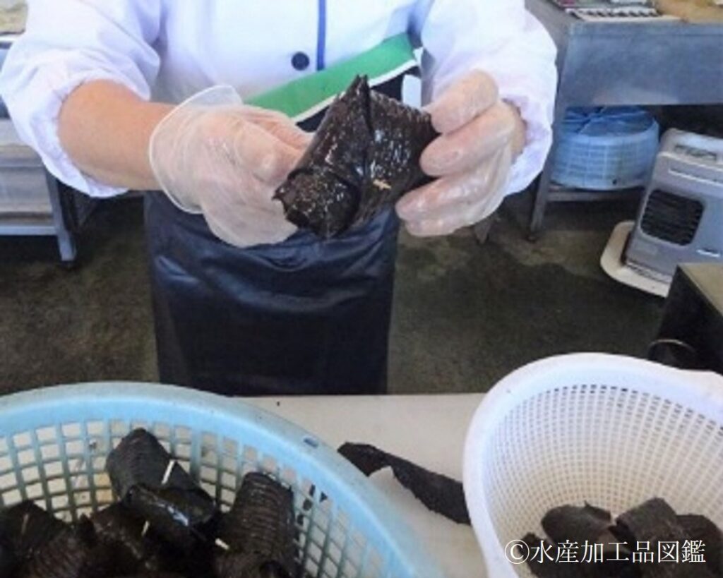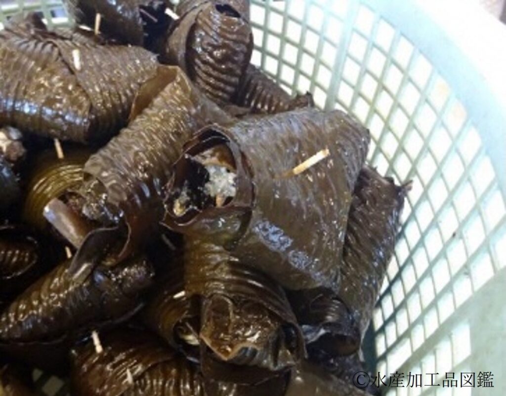 - あらめ巻き 水戻ししたアラメ(写真2)の葉状部2~3枚を用いて二ツ折りにした素焼きのフナを三角に巻き込み、解けない様に爪楊枝を打つ(写真3, 4)。大きいフナは二つに切り分け、同様に巻く。