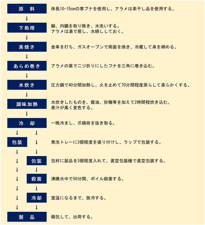 - 原料 体長10~15cm程度の小型の寒ブナを使用している。アラメは素干し品である。