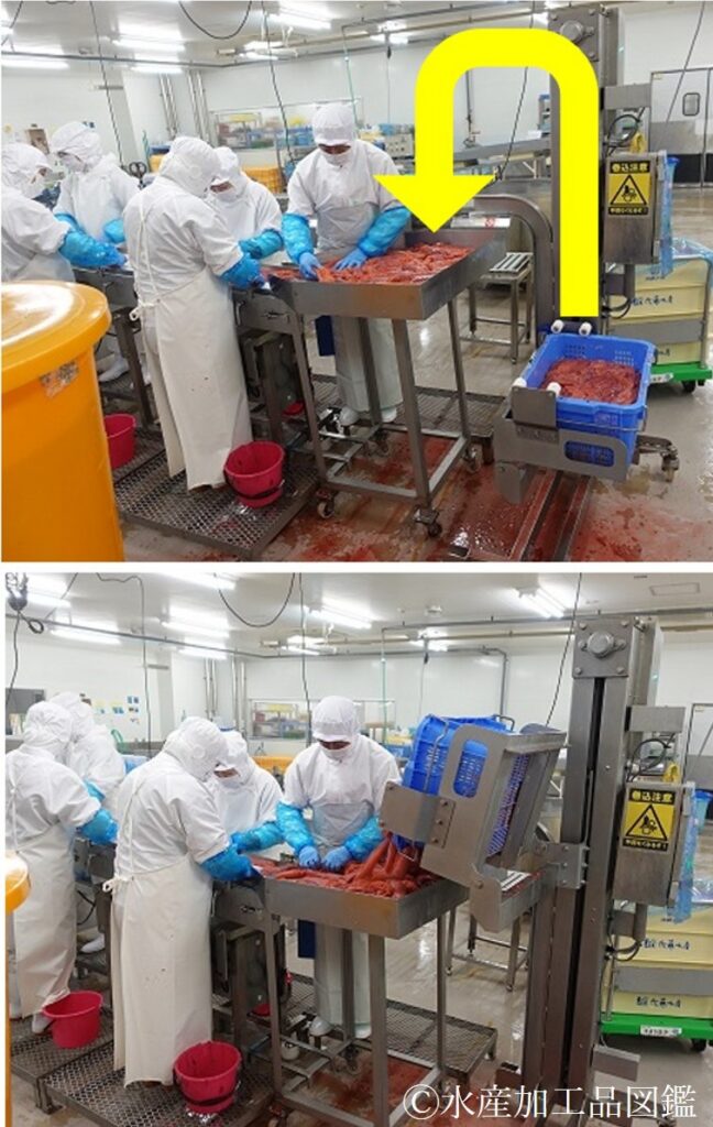 (左:工場内に搬入、中:生筋子採取エリアに搬送、右:生筋子採取エリアに搬入)(佐藤水産(株)提供)