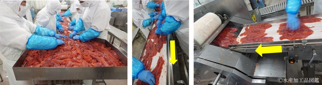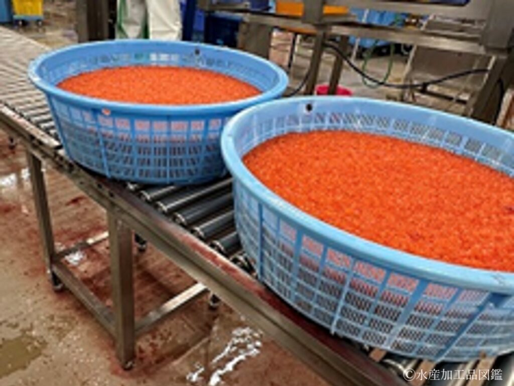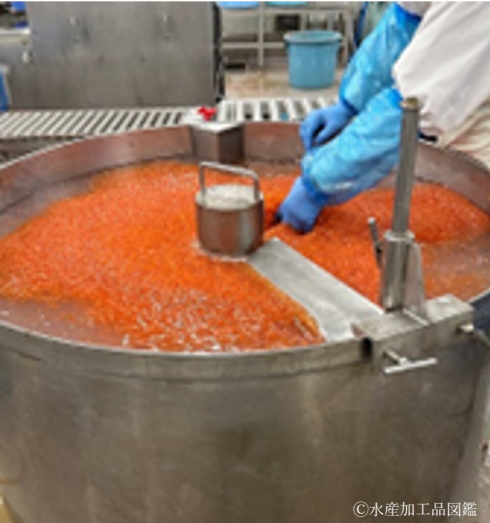 • 原料、生筋子採取、卵粒分離、洗浄・水切り これらの工程は、上記の醤油いくらと同様に行う。