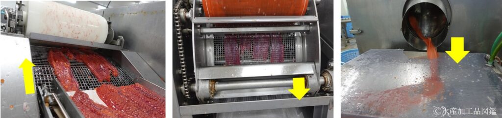 写真9 生筋子をローラーで金網部に押し当て卵粒を分離(左)、卵膜は卵粒分離機の網上に残る(中)、分離された卵粒は洗浄工程へ送る(右)(佐藤水産(株)提供)