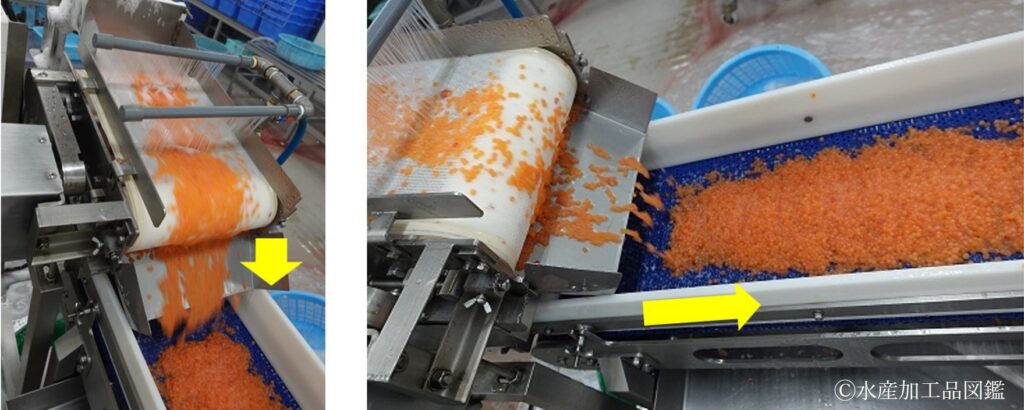 写真5 卵粒分離、洗浄、調味漬けエリアへ