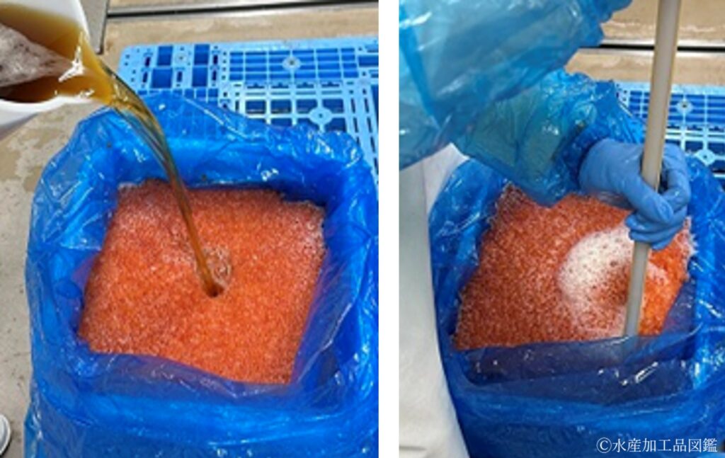 ①の醤油漬けいくらと同様に、分離洗浄した卵粒を飽和食塩水で撹拌塩漬けする。塩漬けにより卵粒の脱水、塩の浸透が促進され、濃厚で美味しい製品に仕上がる。