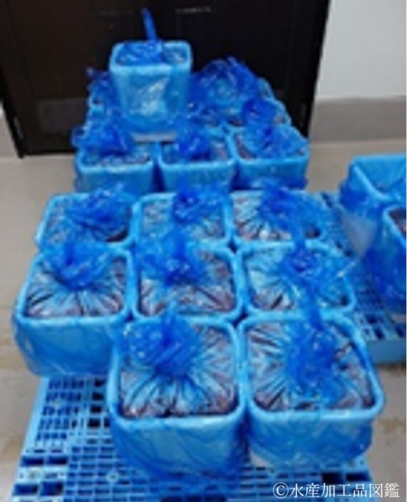 冷蔵では賞味期限が7日間程度であり、長期保管には冷凍が必須である。冷凍保管時の包装材料は、脂質の酸化による品質劣化を防ぎ、長期保管を可能にするため、ポリプロピレンなどを基材とした包材を用い、脱酸素剤を封入するなどの工夫がなされている。