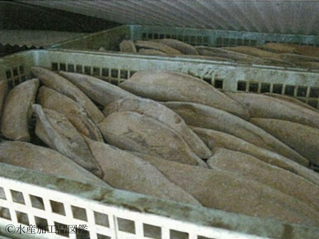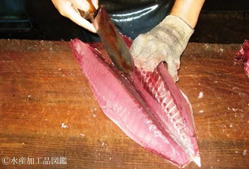 • 身おろし 原料魚が小型の場合は亀節にする。4kg以上の大型の場合、三枚おろしの後、背肉と腹肉に切り離し、4本の節にする。(写真1)