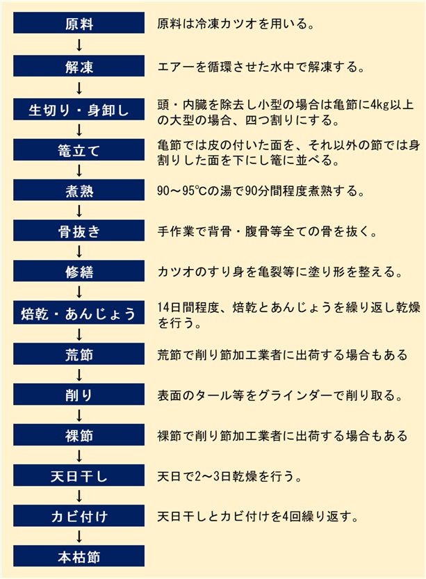 カツオを身卸し後、煮熟、焙乾したものである。半身の状態で製造したものを亀節といい、半身を腹皮と背側にそれぞれ四つ割りしたものをかつお節と呼ぶ。また,焙乾の程度が低く水分の多いものをなまり節、カビ付けを行った本枯節、カビ付けしないものを裸節や荒節と呼ぶ。