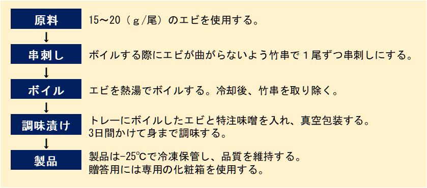 徹底的に鮮度にこだわっている。クルマエビの出荷シーズン中であれば活きクルマエビを原料にし、オフシーズンでは予め誘電凍結(鮮度を維持し、解凍した際にドリップが出ない冷凍方法)を行ったクルマエビを原料にしている。