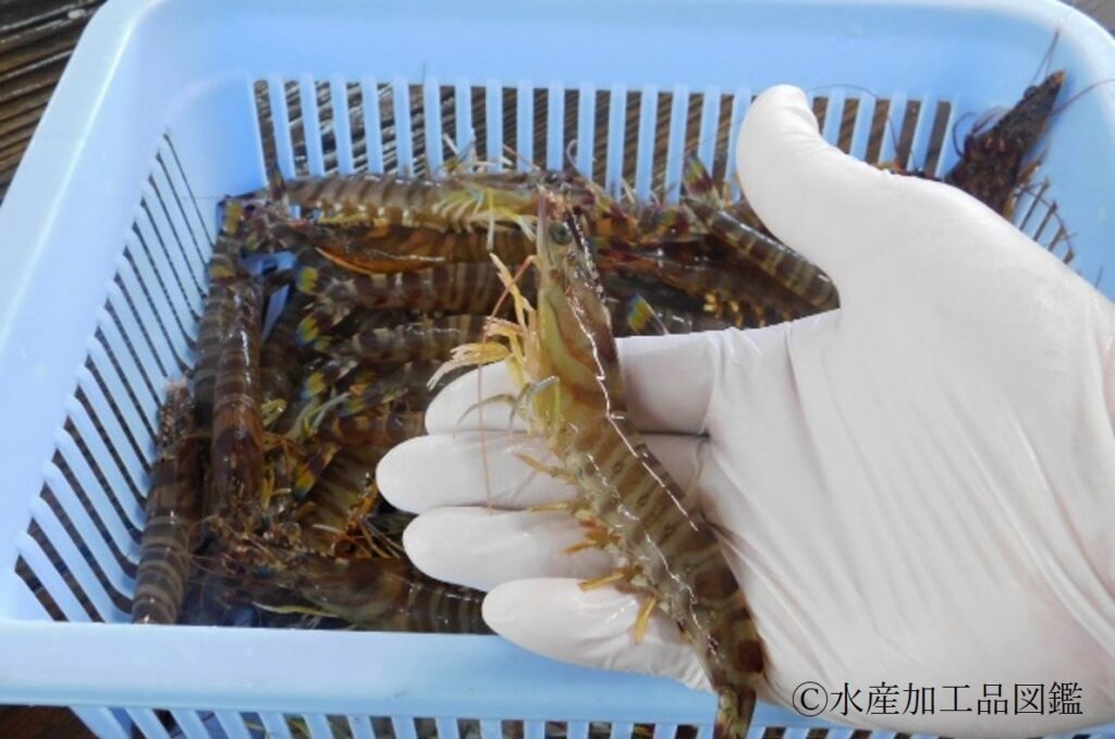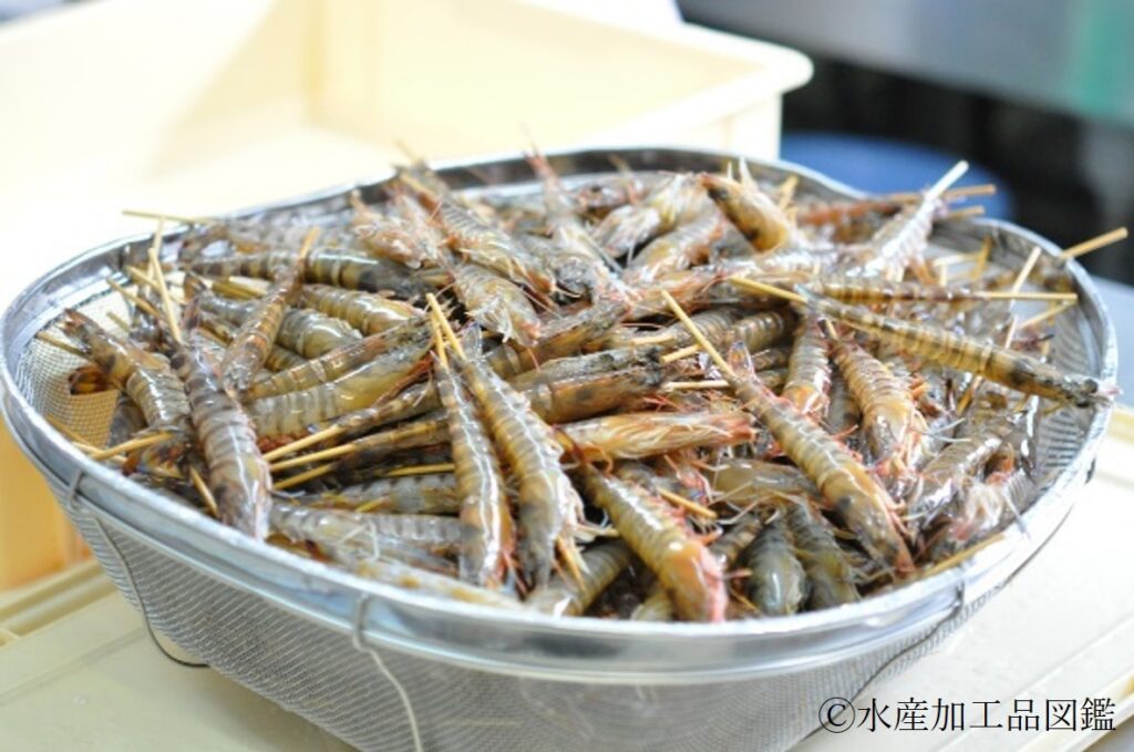 - 原料 基本的には、1尾あたり15~20gのクルマエビ(写真1)を標準としているが、一部商品では、1尾あたり20~25gの大サイズや、規格外等のラインナップがある。