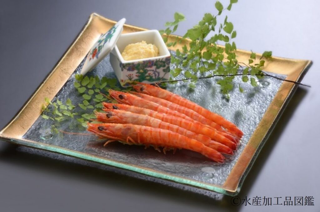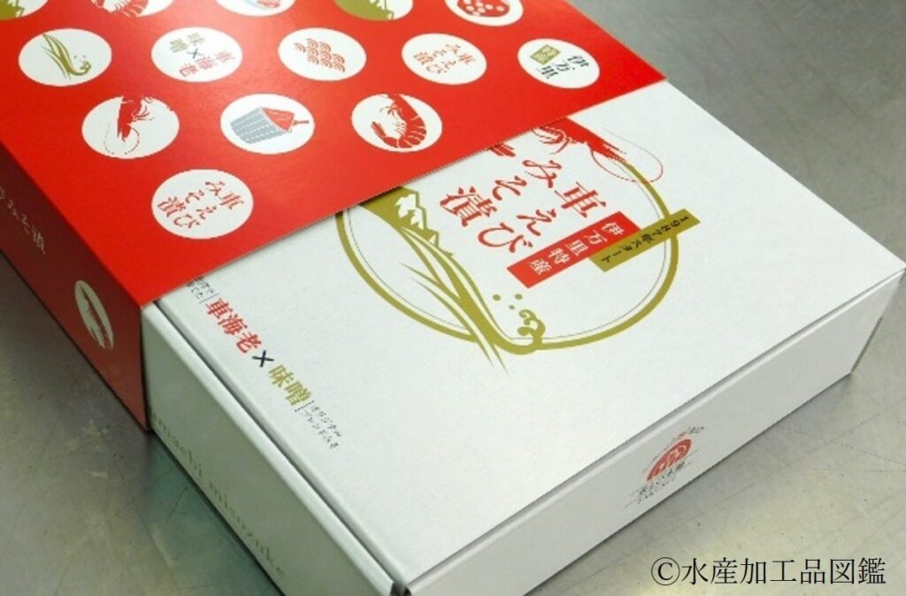専用トレーにボイルしたクルマエビが250g、特注味噌が200g入った状態で、真空包装し冷凍(-25℃)している。専用の化粧箱に入れて発送する。