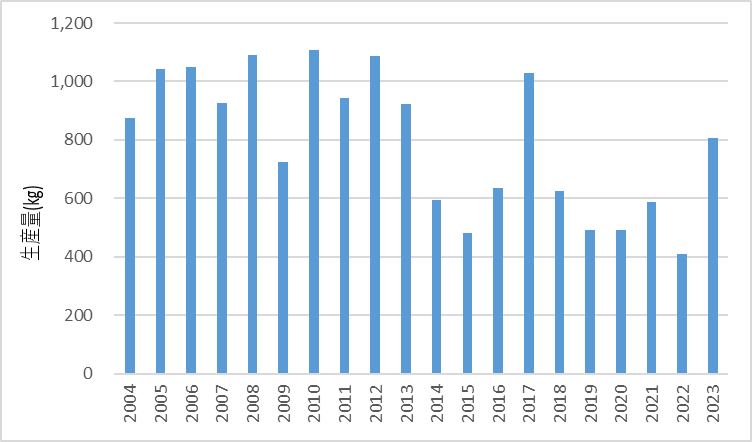 生産量と単価を図1に示す。生産量はその年の天候や海況によって左右されるため年変化は大きいが、概ね0.5~1トン/年程度で推移している。単価はその年の生産量や品質によって上下するが、100gあたり3,000~7,000円程度で取り引きされている。