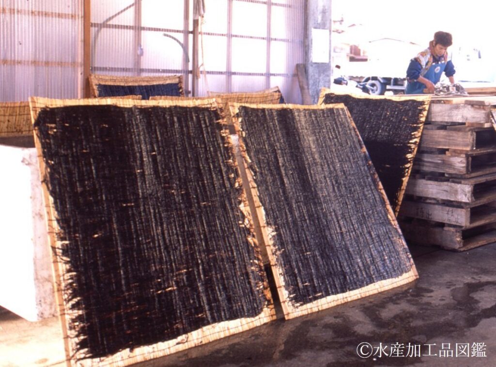 採取した生ノリを手作業で隙間なくすだれに並べ、納屋等において陰干しで乾燥をさせたものである。