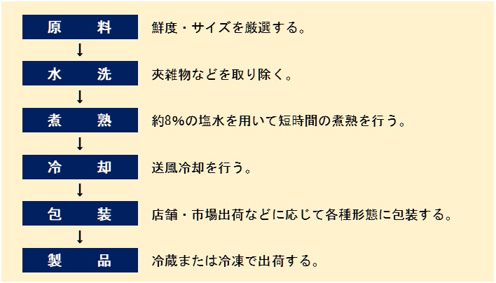 - 煮熟 沸騰塩水に投入した原料は数十秒で浮上するので網などですくい上げる。煮釜の大きさは約800ℓ容のものが多く、この容量ではトロ箱(15kg入り)2箱分の原料を同時に投入しても迅速に煮熟できる。煮熟水の塩分は約8~10%であり、大量の原料を処理する場合は、途中で煮熟水に塩を追加する。使用する塩は並塩が一般的であるが、近年は各種天然塩を併用して品質の差別化を図っている。
