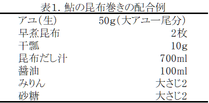 鮎の昆布巻きの配合例を表1に示す。