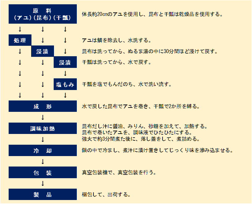 アユ、昆布、干瓢を昆布だし、醬油、みりん、砂糖等で作製した調味液に浸漬し、長時間煮た後で、真空包装するので、製品が空気に触れることがなく、保存性の点ではかなり有効な加工方法だと言える。