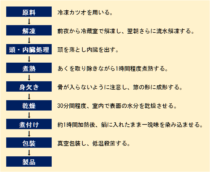 原料のカツオは鮮度保持のため、仕入れ後すぐに冷凍する。適正な殺菌効果を得るとともに過加熱による品質変化を防止するため、低温殺菌は時間と温度を管理する。