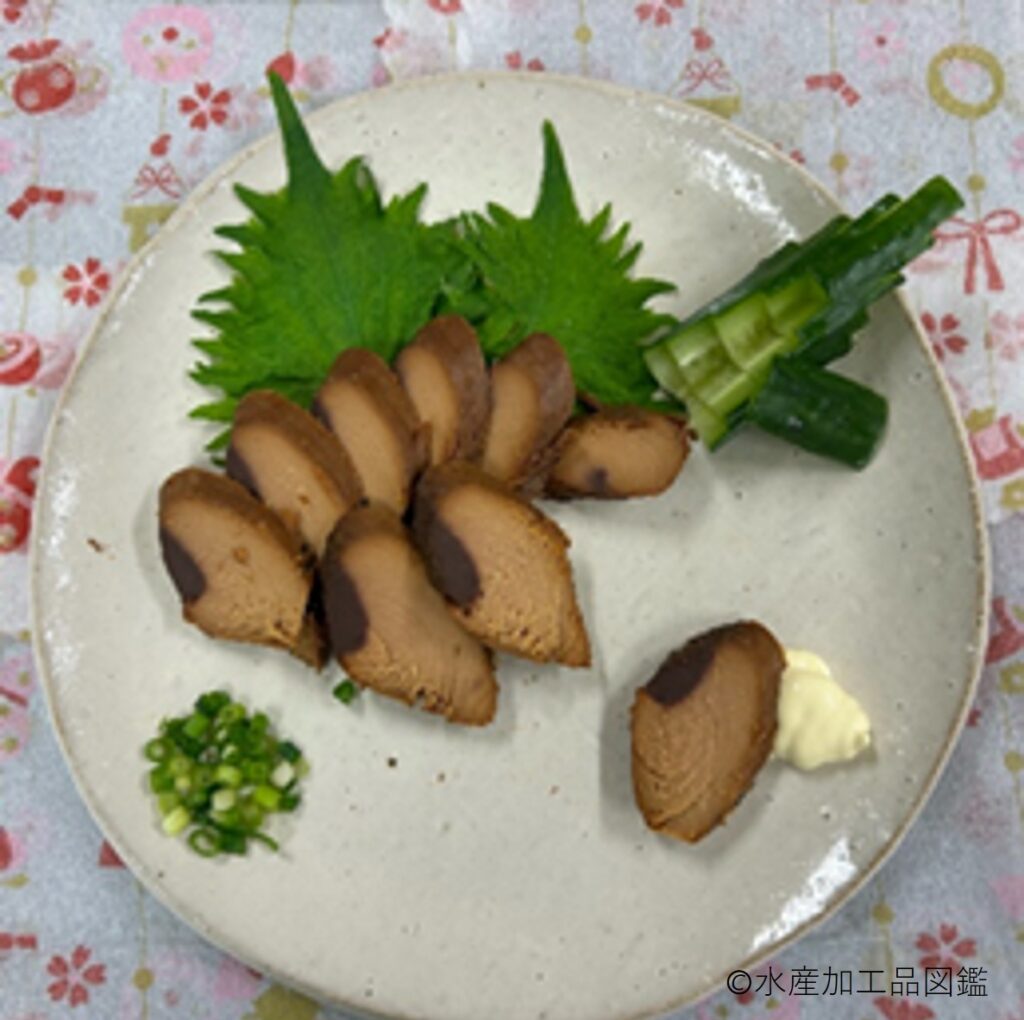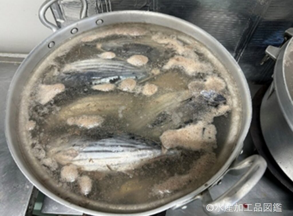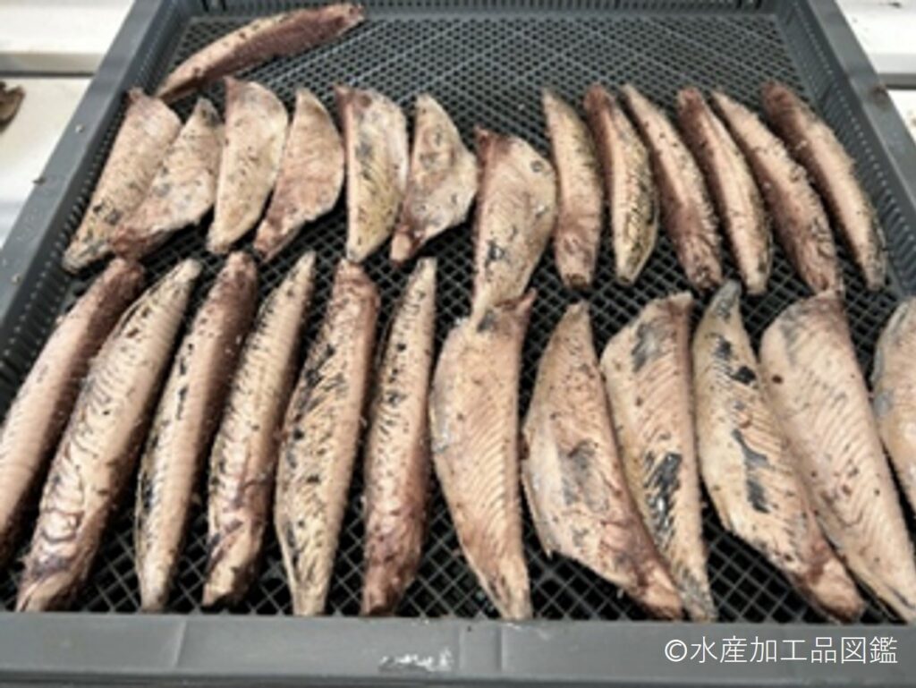 かつお醤油節は、煮熟したカツオの節を、醤油を主体とした調味液で煮付けた製品である。