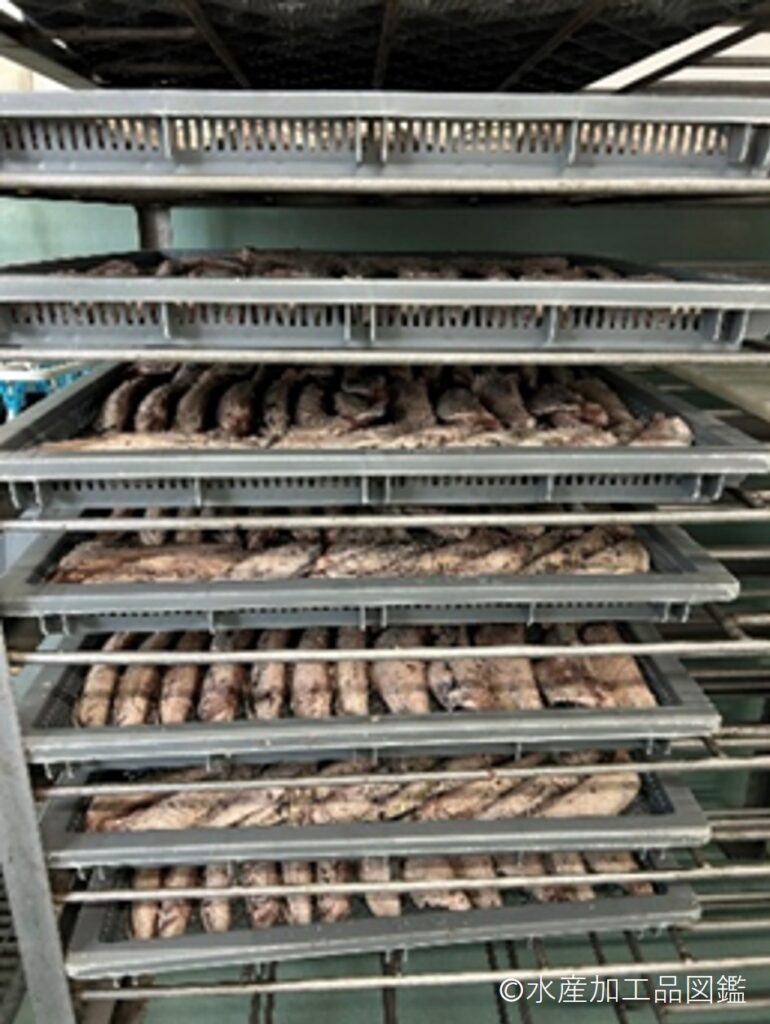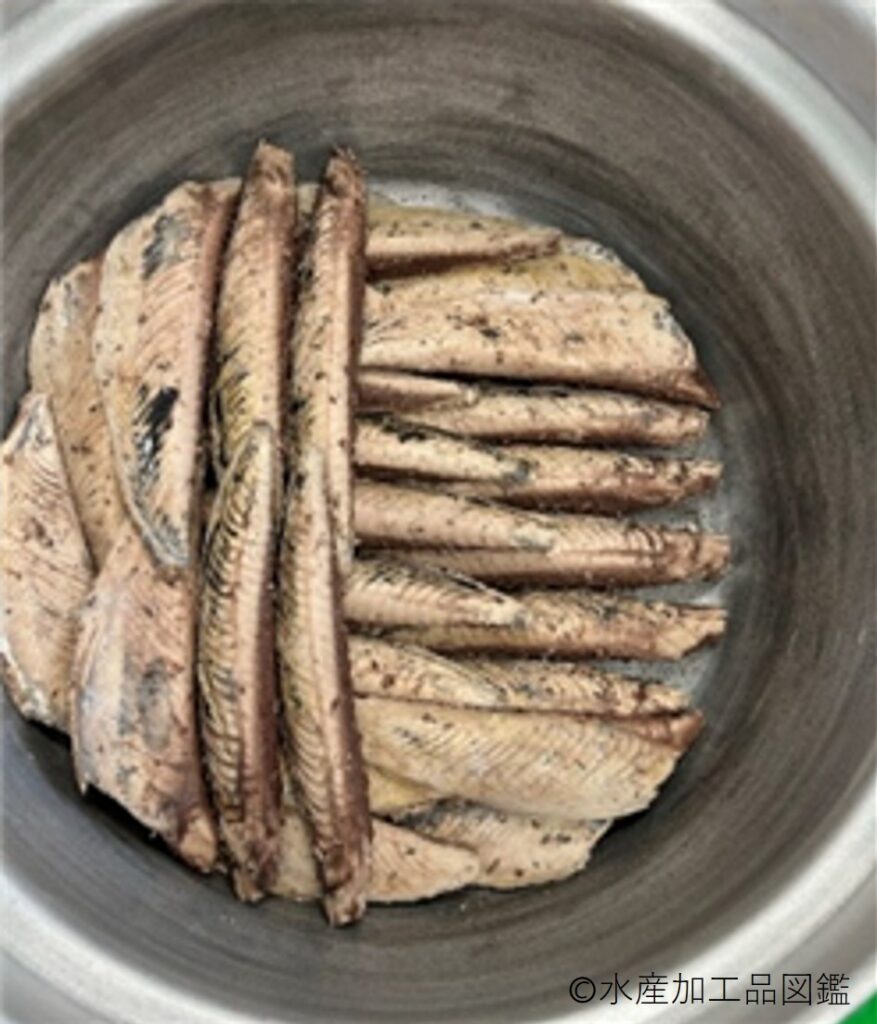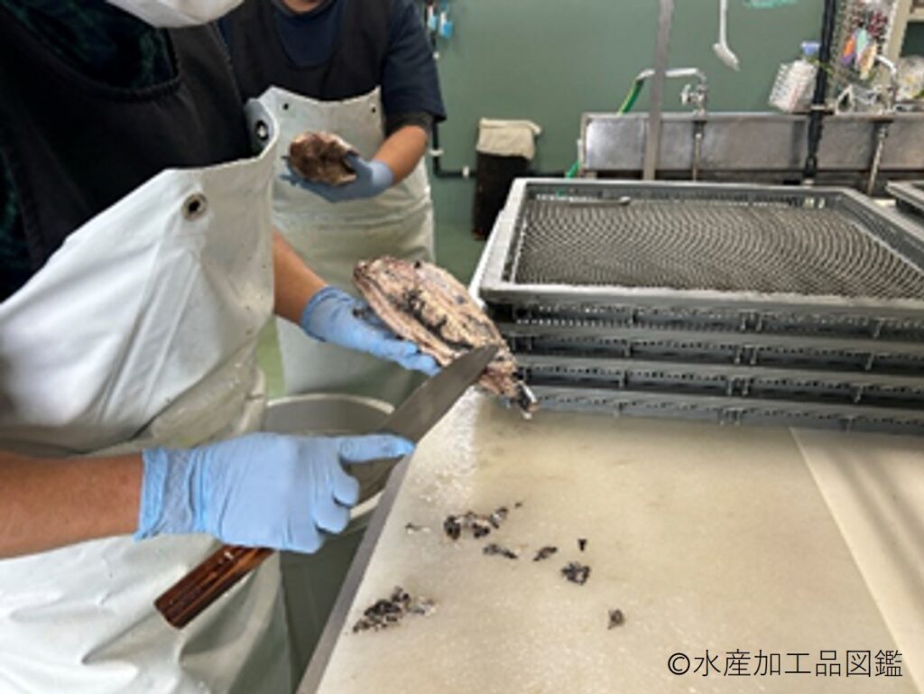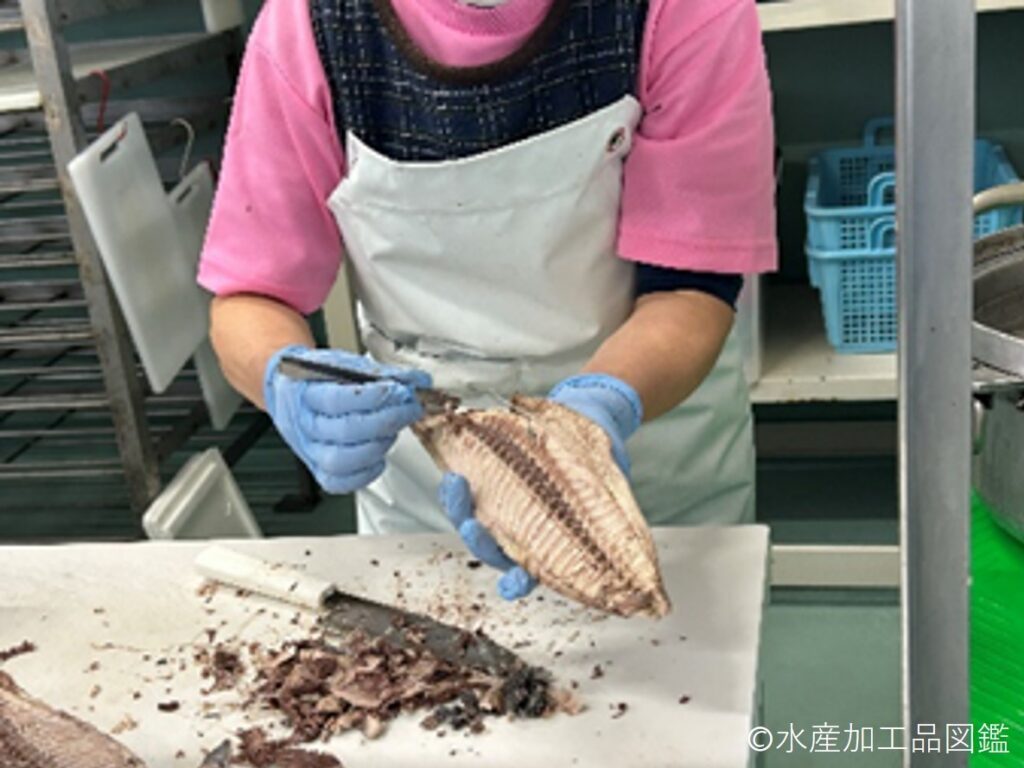 骨を取り除き、きれいな節状に形を整える「身欠き」が重要である。ラウンドの状態から全て手作業で行うが、身が割れやすいため全工程において強い力をかけず、丁寧に行う。