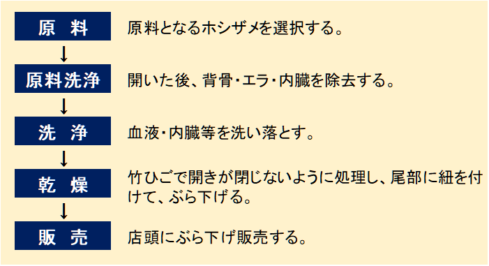 原料となるホシザメは延縄漁で混獲され、新鮮なものほど良質(色、味等)とされる。大きさは特に決まっておらず、40cm程度から1mを超えるものまでが原料となる。近年、漁獲が不安定になっており、地区内だけでは原料が不足しているため、糸島市の建て網(刺し網)で漁獲されたものも使用されている。