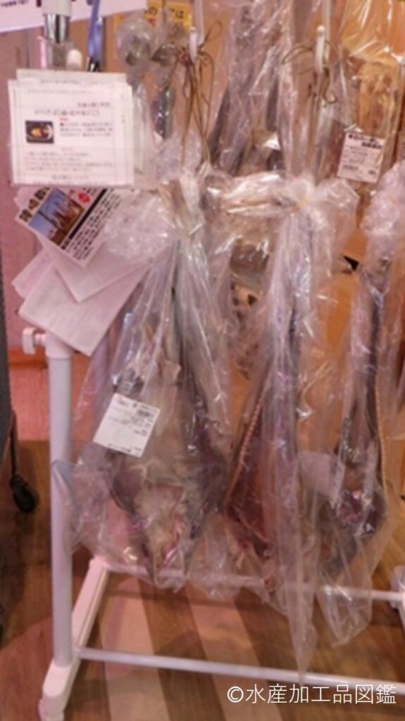 開きにした板状。鉈や小鋸で切るほど堅い。店頭では包装せず販売時に包装紙またはビニール等で包む。