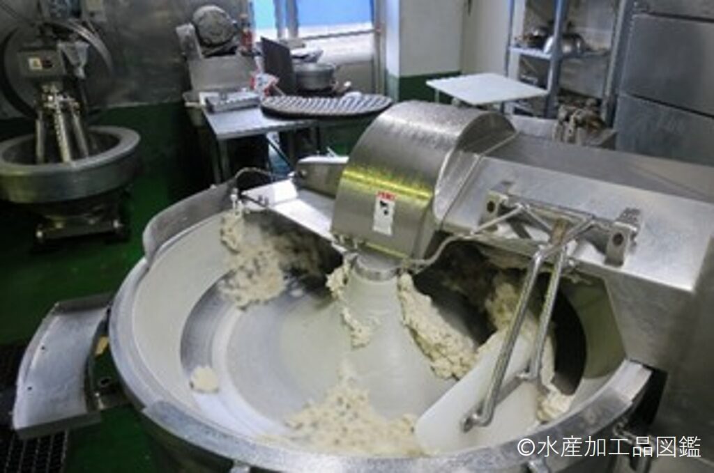 竹ちくわの加工技術において、塩ずり工程は非常に重要な役割を果たす。塩ずりでは、魚肉中の塩溶性タンパク質を十分に溶出させ、適度な粘りを引き出す。塩ずり中の肉糊の温度を低温に保つことで、製品の食感を安定させ、品質を維持することができる。