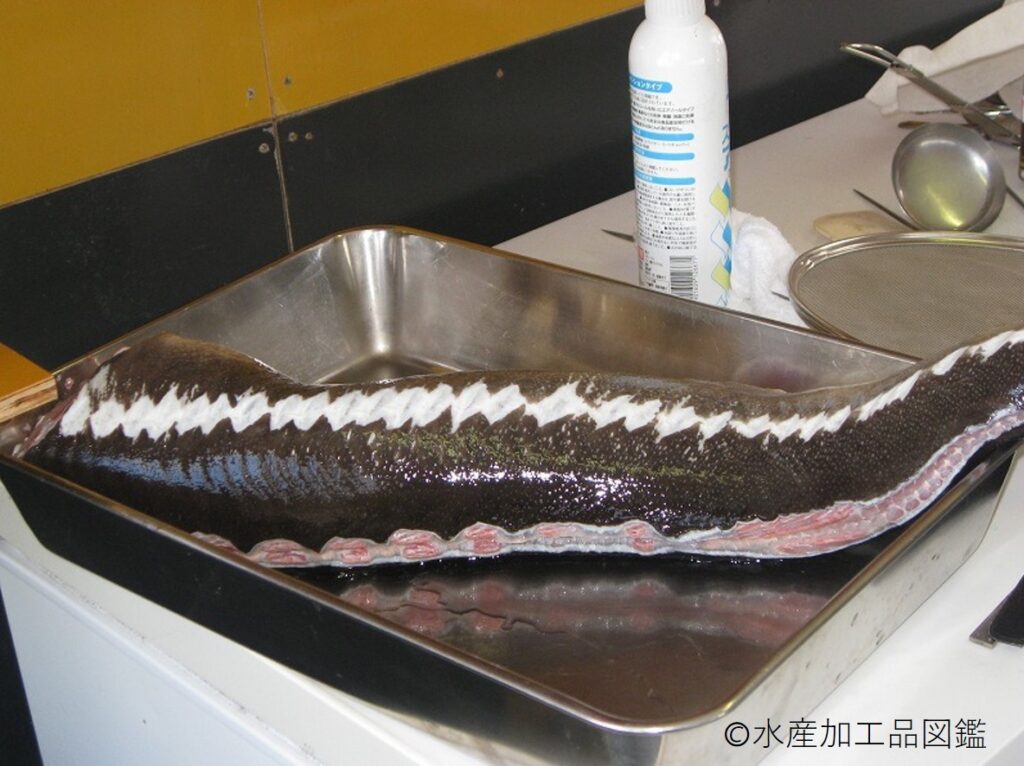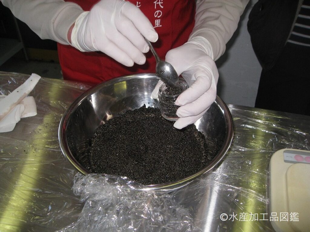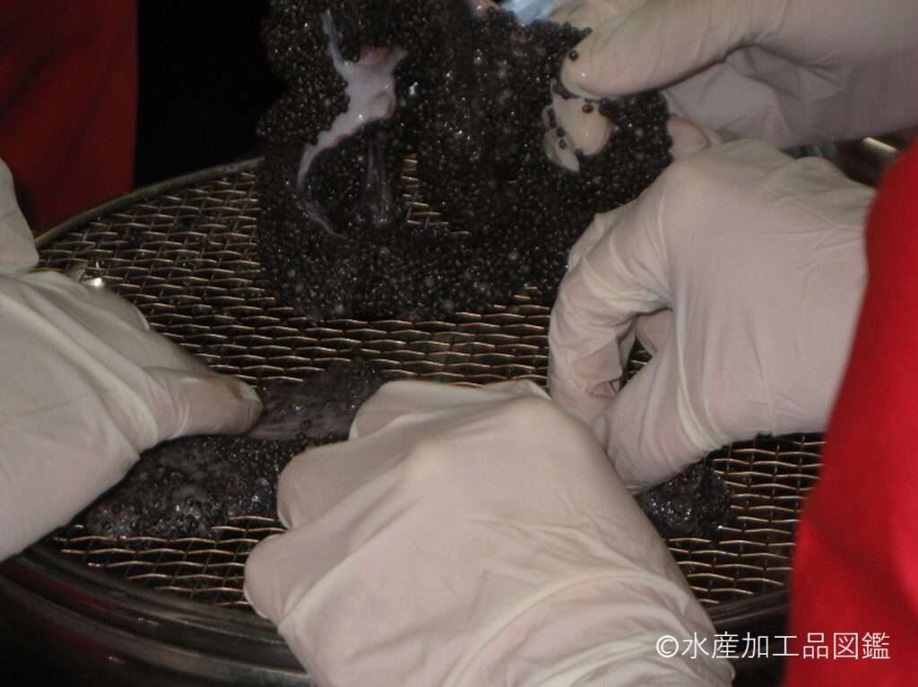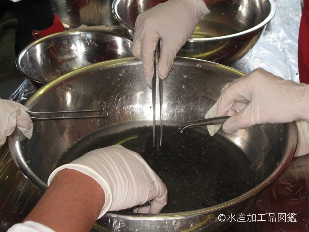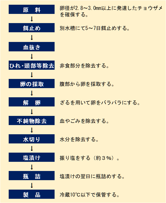 水揚後の餌止めと解卵、異物除去後の水切りが重要である。製造作業の道具は湯煎で殺菌する。