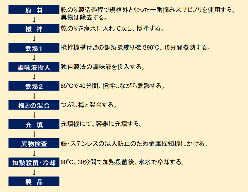 一番摘みの乾海苔加工の際に生じる規格外品(破れ等のある形状不適品)を用い、これを一度浄水に戻して、醤油・みりん・砂糖を主体とした調味液により煮詰めて製造する。乾のりの舌の上でとろけるやわらかさを引き出しつつ、特製の調味液で味付けを行い、仕上げに南高梅を加えることで酸味のある旨さに整える。また、保存料や着色料を一切使用せず、類似商品とは差別化を図っている。