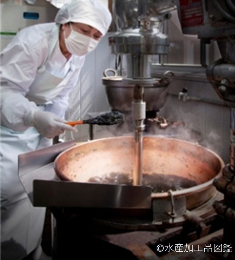 - 調味液投入 調味液を投入する。添加する調味液は佐賀市漁村女性の会独自の配合で、特注した丸大豆醤油・本みりん・砂糖・塩等を使用する。