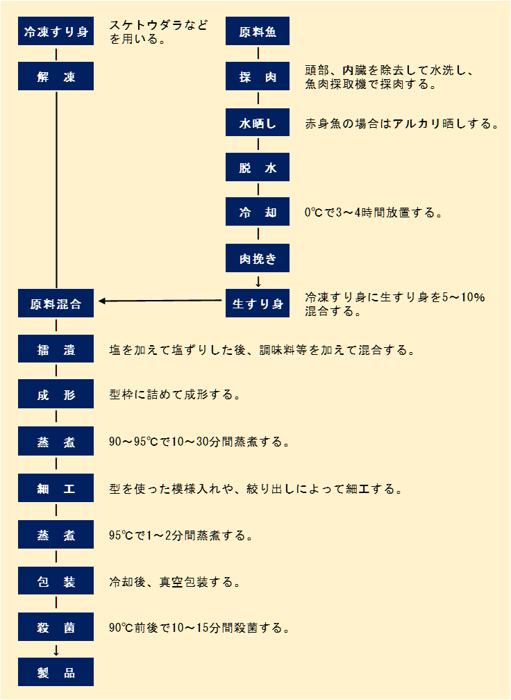 - 原料混合 スケトウダラ冷凍すり身に対し生すり身を5~10%混ぜる。そのほか、塩、アミノ酸、でん粉、卵白を混合する。