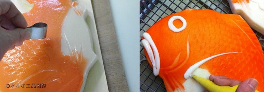 擂潰までの工程は、一般のかまぼことほとんど同じである。擂潰した肉糊を型枠に詰めて成形し、食用色素を混合した肉糊を絞り出して細工している。坐りをかけないため独特の食感になっている。