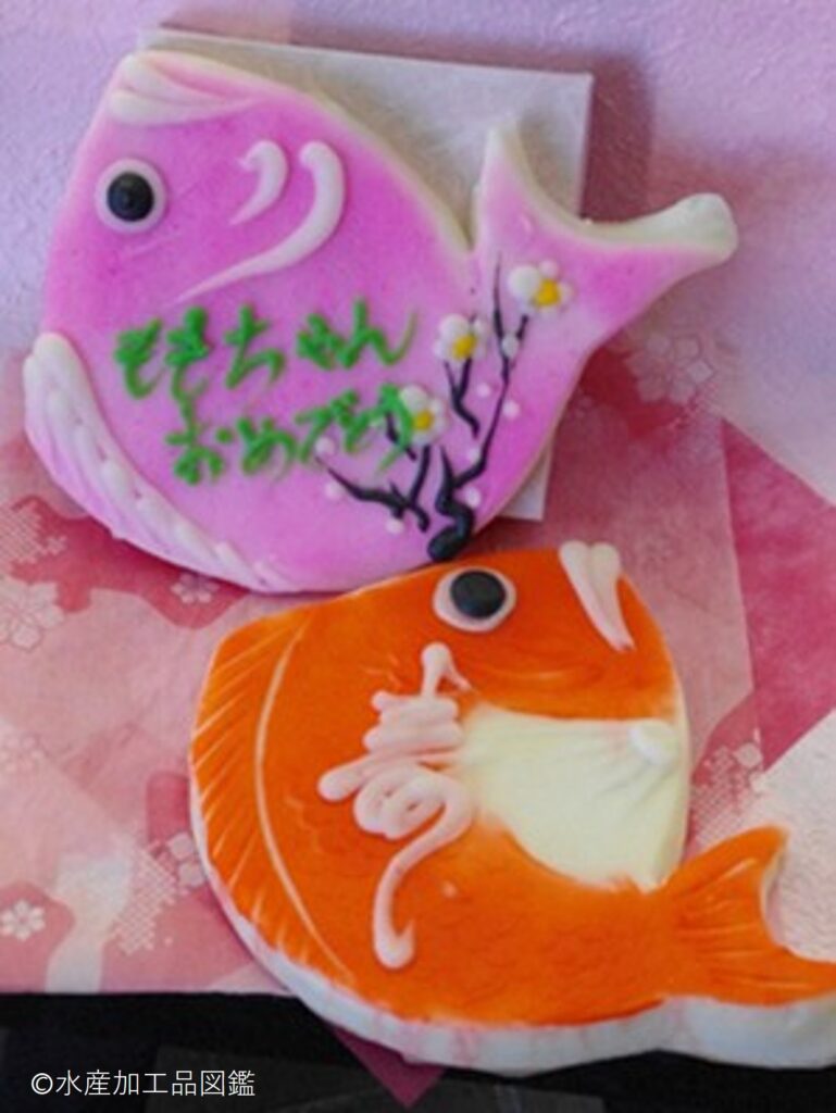 彩色を施した鯛、富士山、鶴、亀、海老、宝船、扇子、松竹梅などの形状で引き出物や土産物に用いられる(写真2~4)。