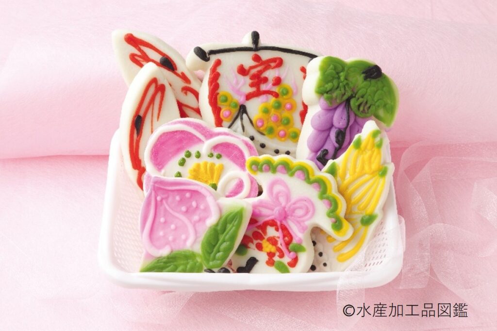 彩色を施し鯛、富士山、鶴、亀、海老、宝船、扇子、松竹梅などを象ったかまぼこである。主に絞り出しによって加工されている。富山県では「飾りかまぼこ」とも呼ばれ、結婚式をはじめ慶祝事に欠かせないものとして県民に親しまれている。