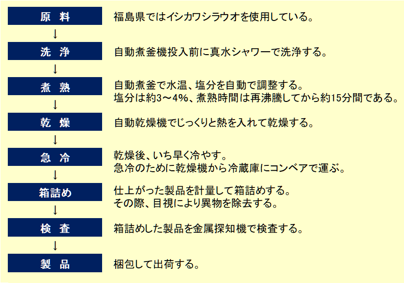 • 煮熟 自動煮釜機で水温、塩分を自動で調整する。塩分は約3~4%、煮熟時間は再沸騰してから約15分間である。