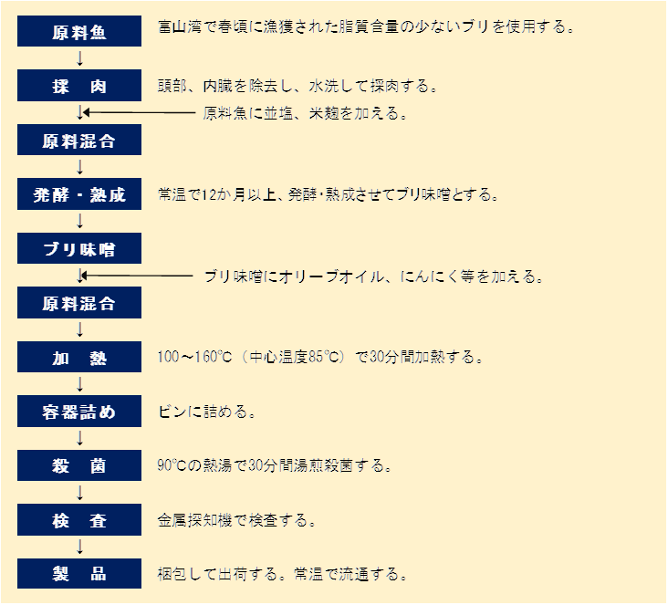 主原料となるブリ味噌(魚味噌)については、米味噌の製造技術を応用したものである。すなわち、米味噌の原料である大豆の代わりに魚肉(ブリ)を用いて米味噌製造方法に準じた製造技術により発酵・熟成させる。