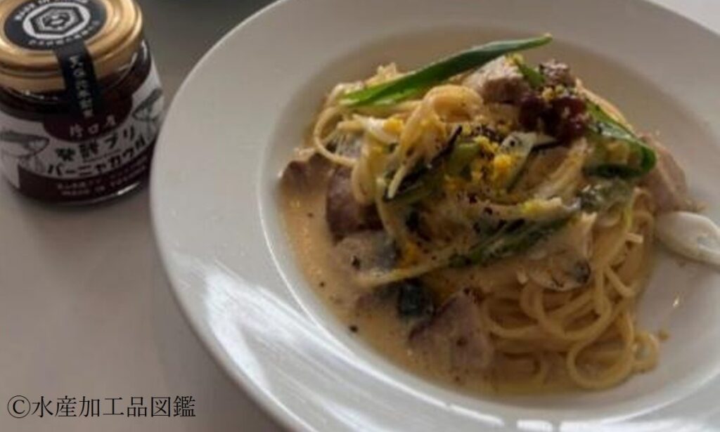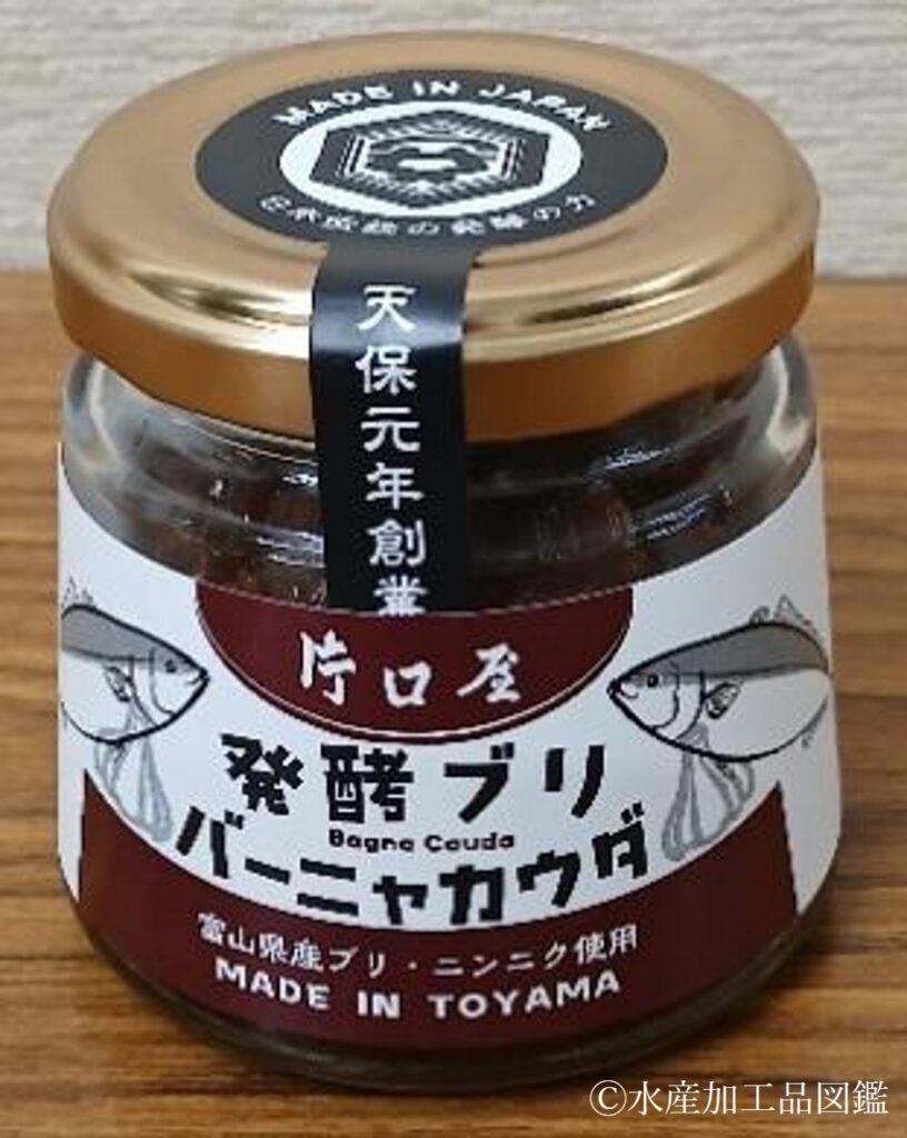 ブリのバーニャカウダは、ブリの身に米麹、塩を加えて混合・攪拌後、ブリ味噌(味噌と同様に発酵・熟成させた味噌様の発酵調味料、第3章第4節「ブリ味噌」参照)を主原料とし、オリーブオイルとニンニク等を混合したバーニャカウダソースである(写真2)。富山県農林水産総合技術センター食品研究所の技術協力により開発された。新聞やテレビ等でも取り上げられ、国内外の土産物店等で販売されている。