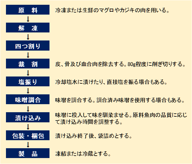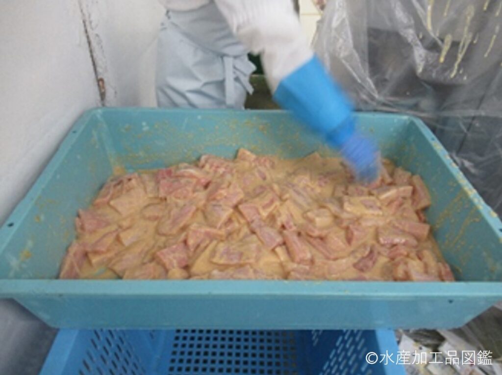 - 漬け込み 魚肉片1つ1つに調合した味噌を刷毛などで塗りつけを行う。大量生産するときには、どぶ漬けという大型の容器に調合した味噌を入れ、直接、前処理した魚肉を投入し、数時間から数日間かけて味を馴染ませる(写真3)。この工程にかける時間は魚種やその品質(生鮮、解凍原料等)により異なり、短時間で済ませたり長期間の熟成を行う場合もある。