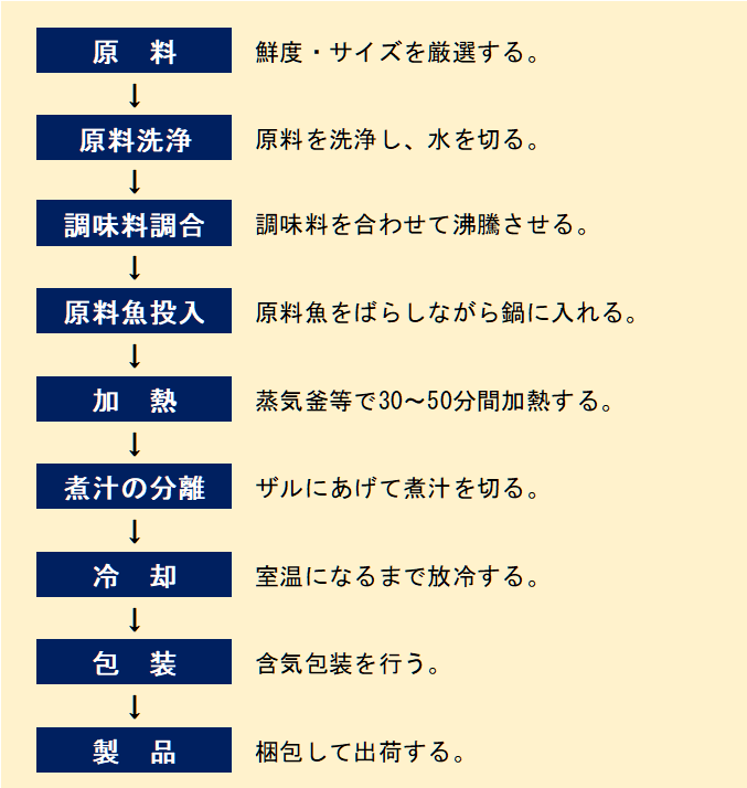 - 加熱 鍋や蒸気釜等で30~50分間加熱を行う。魚と魚が直接重ならないように気をつけると煮崩れせず、炊き上がりも美しくなる。一般に鍋の蓋を使用せずに煮る。小さいものは30分間、大きいものは40分間かけて煮る。それ以上炊くと硬くなり、かえって日保ちがしない。