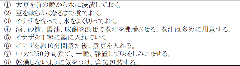 魚介類を濃厚な調味液中で高温で加熱することにより耐熱性芽胞形成菌以外を死滅させ、糖分や塩分を含む調味料を加えることで味付けと同時に水分活性を低下させ、保存性を高めている。