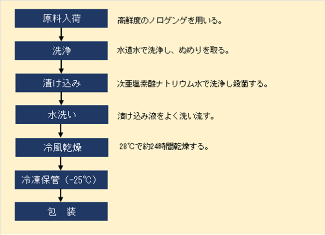 原料の鮮度保持、ぬめり取りのための前洗浄やその後の次亜塩素酸ナトリウムによる洗浄と殺菌のための漬け込み、乾燥工程の温度と時間の調製が品質管理上重要である。