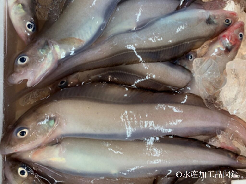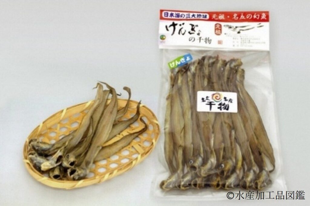 げんげ干物は、ゲンゲを丸ごと乾燥して干物とした製品である。一般的には「ゲンゲ(幻魚)」と呼ばれている魚には数種類あるが、干物に用いられるのは主に「ノロゲンゲ」という種類である。地方名ゲンギョ、ミズゲンギョなどいろいろな呼び名があり、体の特徴としては細長く白っぽい色をしている。何よりの特徴は全身がゼラチン質(※)で覆われ、「ズルッ」「ヌメッ」とした触感があり、かなり「水っぽい」魚である(写真1)